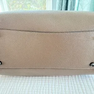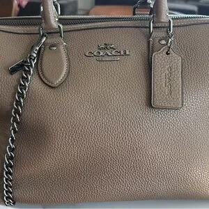 Coach pebbled leather satchel in a warm taupe hue. Polished metal logo and chain strap accent. Detachable leather hangtag adds signature detail. Structured silhouette for everyday wear.