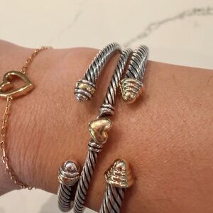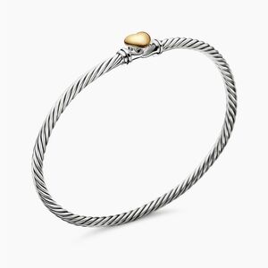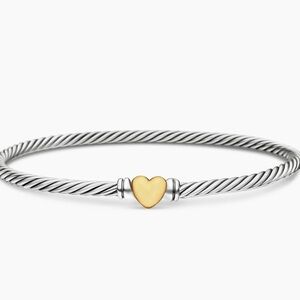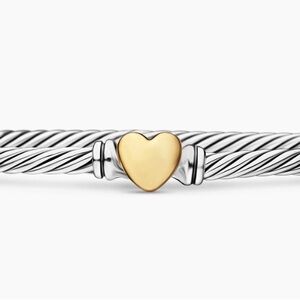 This elegant bracelet features a sleek silver band with a charming gold heart accent. Perfect for adding a touch of sophistication to any outfit.