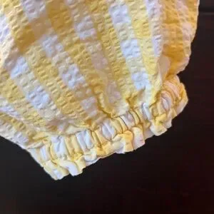 Charming yellow puff-sleeve dress with a smocked waist for a comfortable fit. Lightweight, textured seersucker fabric creates a playful look. Easy on-off neckline and elastic sleeves for flexible wear. Perfect for everyday play or special outings.