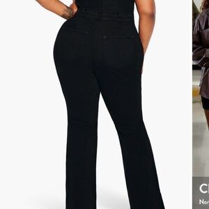 Sleeveless black jumpsuit with front lace-up detail. Multiple flap and zip pockets for a utility look. Structured seams for shape. Classic versatile piece. Identified color: black.
