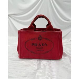 This is a pre-owned Prada Canapa canvas tote bag in red