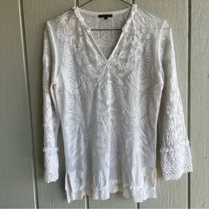 Ethereal ivory lace tunic with intricate embroidery throughout. Sheer mesh base, V neckline, and softly fluted cuffs with delicate trim. Romantic yet refined—effortless over swim, silk slip, or tailored trousers.