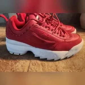 Bold red upper with thick white platform sole. Lace-up front and padded collar for support. Textured outsole adds grip and style. Iconic Fila branding on side and heel.