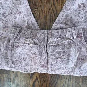 Chic mauve pants with floral accents. Elastic waistband for comfort.