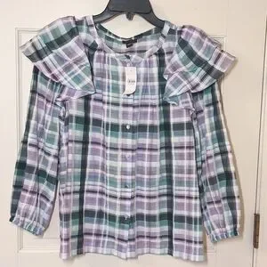 NWT Ann Taylor Cotton Plaid Ruffle Sleeve Top, Size S