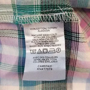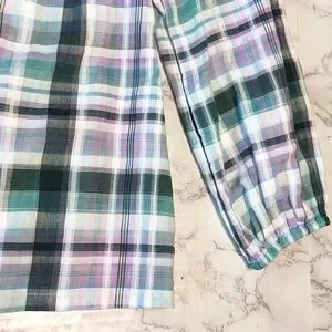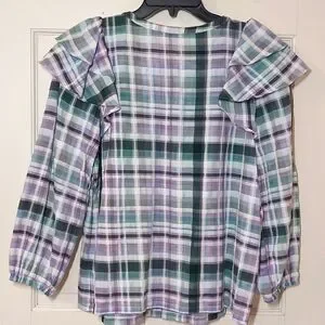 Beautiful plaid top with ruffled shoulder detail, size S. Lightweight cotton fabric- green, lavender and white plaid.