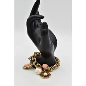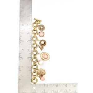 • Design: Chunky link bracelet adorned with multiple decorative charms including a cameo-style locket, faux pearl drops, floral filigree elements, and pink cabochon accents