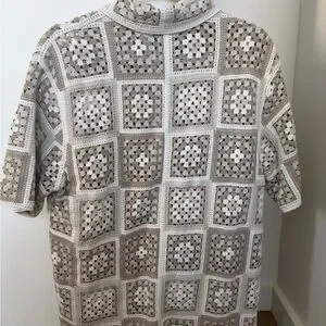 Abercrombie & Fitch crochet short-sleeve button-down. Neutral beige and white square crochet pattern. Camp collar for a relaxed vibe. Breathable open-knit construction. Easy to style with casual bottoms.
