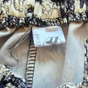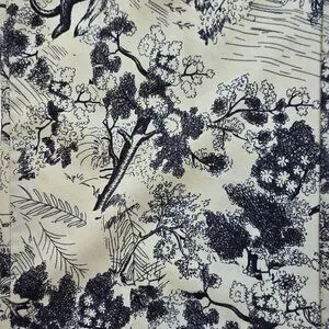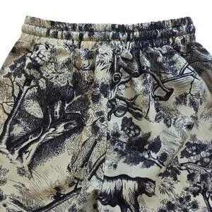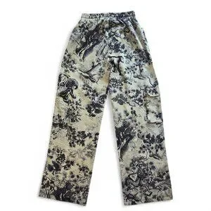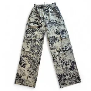 These wide-leg pants feature a striking blue toile print on a beige background, offering a classic aesthetic with a modern twist. Designed with an elastic waistband and functional side pockets for ease and practicality. Made from a breathable cotton-polyester blend, combining style and comfort. Dry clean recommended.