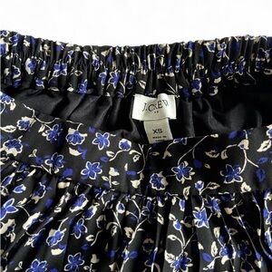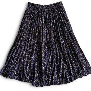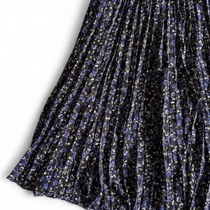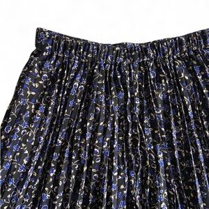 Pleated J Crew midi skirt with a blue floral pattern on a black base and black lining. Elastic waistband, says XS but can easily fit a small. i’m 5’1” and it hits me mid to low calf if i wear it high waisted and is adorable!!