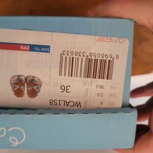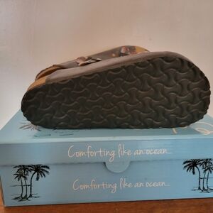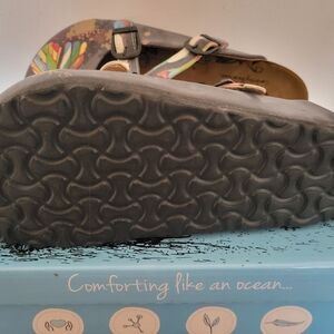 Vibrant butterfly print across the toe. Cross-strap design with adjustable buckles. Multicolor palette with bold accents. Comfortable, casual style.