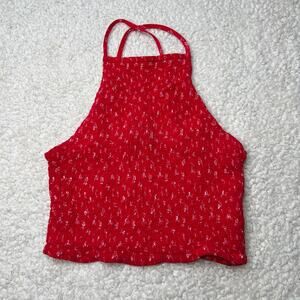 Forever 21 Red Print Crop Top Small. Preowned and in great condition. Top is a crop top with criss cross adjustable straps in the back. Approx measurements are in photos.
