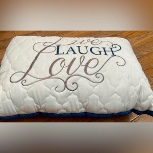 Quilted accent pillow with embroidered "Live Laugh Love" script. Soft white body with navy and gray lettering. Decorative and cozy. Great for sofa or bed.