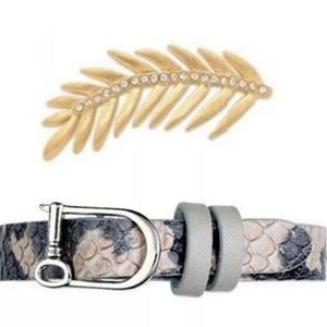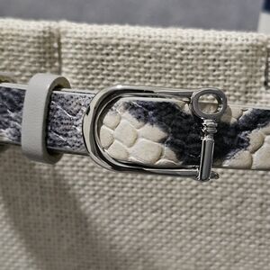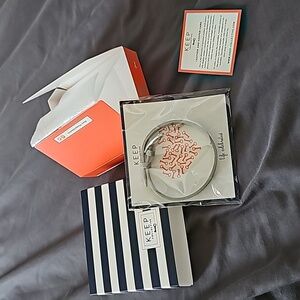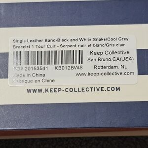 New in box leather Keep Collective bracelet. Reversible, with gray leather on one side and black and white textured reptile snake pattern on the other. Two leather adjustable straps and one silver tone slide closure/holder with key shape. Can be used iwth the Keep Collective charms or worn as a great stand alone piece. Can also be used as a watchband for slide on watch face. Reversible black and white snake to cool gray. Perforated and printed leather band with silver buckle closure. Grab a great resellers lot or a group gift...see discounted pricing below for purchase of 3 or more.