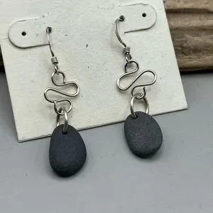 Embrace the serene beauty of the coast with these one-of-a-kind handmade drop earrings! Each earring features a smooth, natural beach rock, ethically collected and lovingly incorporated into a unique design. The organic shape and muted tones of the beach stones are beautifully complemented by artfully hand-formed sterling silver wire, creating an elegant, flowing silhouette. The solid sterling silver ear hooks ensure comfortable and hypoallergenic wear. These artisan earrings are perfect for adding a touch of earthy charm and coastal chic to your everyday look, or for making a subtle, nature-inspired statement. A truly unique gift for beach lovers, nature enthusiasts, or anyone who appreciates handcrafted jewelry with a story. Item 1571