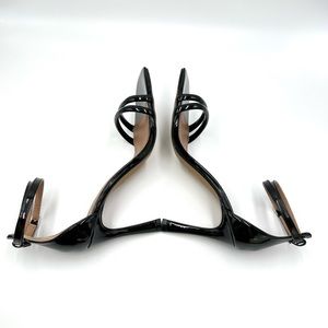 Sophisticated and minimalistic black patent wrap dressy sandals. Elevated by a flared stiletto heel, glossy finish and square toe, this feminine pair is simple and effortlessly chic.