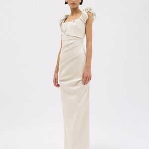 Floor-length gown with a square neckline, pleated ruffle cap sleeves, and a draped fitted skirt. Perfect for black tie events, galas, and formal occasions.