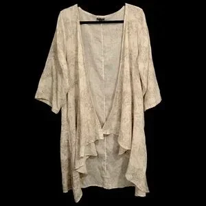 Excellent used condition. Size L/XL. Features an open draped front and side open pockets. Colors are browns and cream.