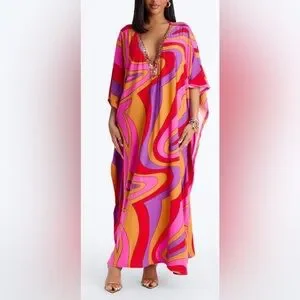 Bright and bold kaftan dress with swirling patterns. Features red, pink, orange, and purple hues. Perfect for a statement look.