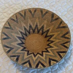 Hand Crafted African Coil Zigzag Pattern Basket in Tan and Blues Vintage?