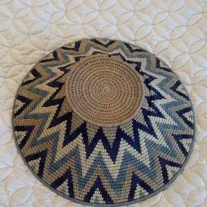 Enhance your home with this Hand Crafted basket. Features a bold zigzag pattern in tan and blues. Perfect for stylish storage. A unique piece that may be vintage. Note in the pictures that the inside of the basket is significantly washed out by sun exposure most likely. It is still beautiful with its woven pattern and subtle shades. The outside maintains its original vibrant colors. Could be hung on the wall as decor or have functional uses as a coffee table piece that will be a conversation starter!