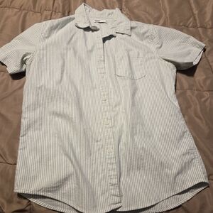 Bundle of Three short-sleeve button-down shirts for men. Two light blue striped shirts with casual summer style. One peach shirt with small palm tree print. Soft, lightweight cotton blends perfect for warm weather. 2 Arizona, 1 Sonoma All Size Medium
