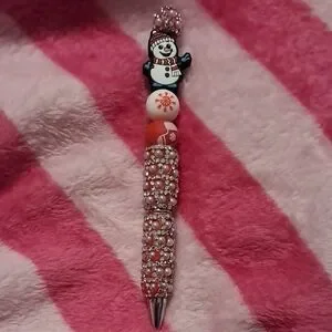 Colorful beaded pen with a snowman design. Features red and white beads.