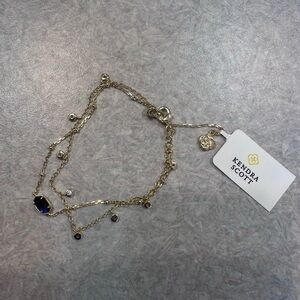 Delicate layered bracelet by Kendra Scott. Features three fine gold chains with small sparkling accents. Centered with a deep blue faceted stone. Secure clasp and adjustable slider for a tailored fit.