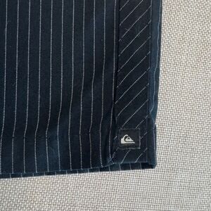 Quiksilver pinstripe walk shorts in a classic black and white colorway. These versatile shorts feature a zip fly with button closure, front slant pockets, and rear welt pockets. The interior waistband is lined with a decorative graphic print, adding a unique touch to a staple piece. Crafted from a durable blend of polyester and rayon, they offer a comfortable fit suitable for casual outings or beachside activities. Small brand logo patches are visible on the front and back for subtle recognition.