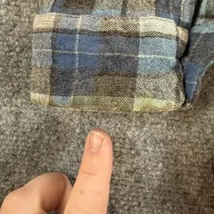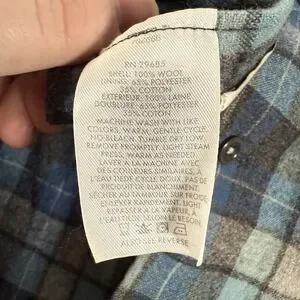 Has staining at end of cuff on one sleeve and a missing button. See pictures for reference.