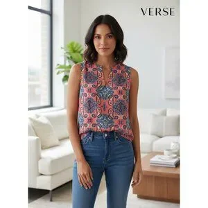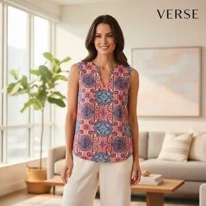 sleeveless blouse, paisley print, coral top, split neck blouse, Verse brand top, chic women's apparel, polyester blouse, colorful women's top, everyday blouse, lightweight summer top, casual women's blouse, semi-formal women's top, sleeveless summer wear