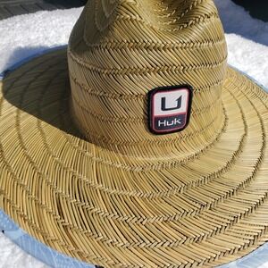 Huk Performance Fishing straw hat features a wide brim with an American flag marlin print on the underside for maximum sun protection and style. Crafted with a durable woven straw construction and a front logo patch, this lifeguard-style hat includes an elastic interior sweatband for a comfortable, secure fit. Perfect for long days on the water or at the beach, it combines functional performance with a patriotic outdoor aesthetic.