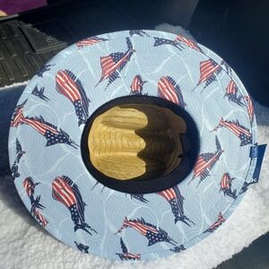 Huk Straw Hat KC Fish and Flag Mens Fishing Sun Hat Tan Blue H7300052-454-1
