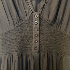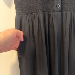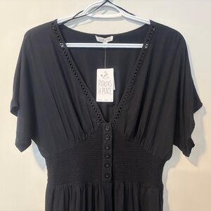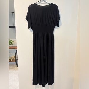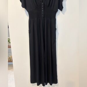 Flowing black jumpsuit by Patrons of Peace in a size medium. Deep V-neck with button-front detail. Short sleeves with a stretchy smocked waist for a defined fit. Wide leg for easy movement. Two pockets!! Super soft lightweight 💯 rayon fabric. Brand new with tags and in perfect condition.
