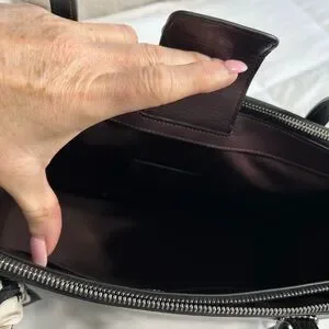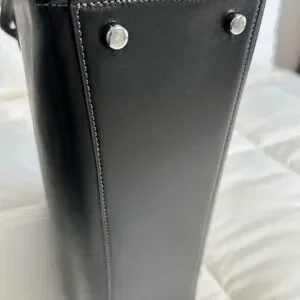 Nina black leather tote by Coach. Features a floral scarf accent. Brand new never used. Still have receipt. $230 new. I chose something smaller for work. My loss your gain !! Size 14x11x4