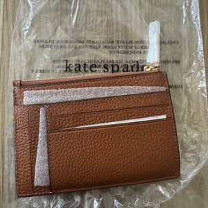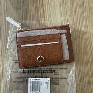 Kate Spade pebbled leather card case. Gold spade logo hardware on front. Multiple card slots and a zip compartment. Sleek, everyday accessory.