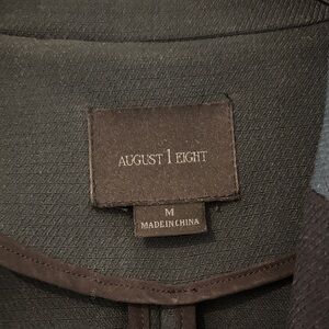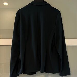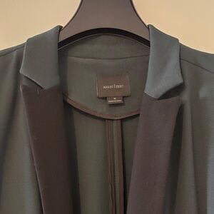 A versatile open-front blazer with a tailored silhouette. Smooth, lightweight fabric offers comfortable all-day wear. Dark green color with black “tuxedo” accents gives a refined, modern look. Designed for easy layering over tops or dresses.