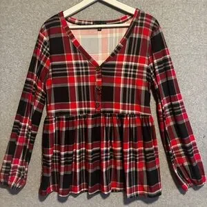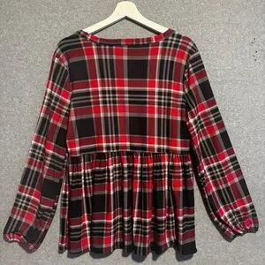Alison Andrews Babydoll V-Neck Peasant Sleeve Blouse M Red Plaid