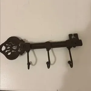Decorative iron key wall hook rack in dark brown. Features three sturdy hooks for hanging coats, keys, or accessories. Classic, vintage-inspired design adds charm to any room. Durable metal construction for everyday use.