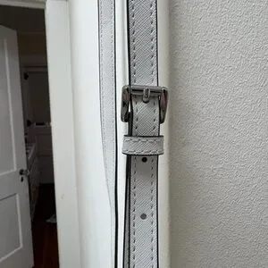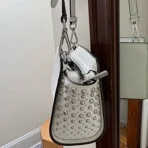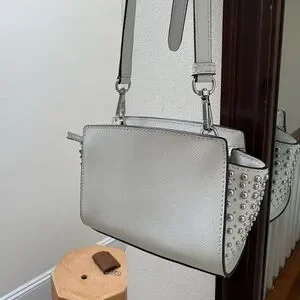 Michael Kors crossbody in white leather. Silver-tone logo and stud accents. Adjustable strap for versatile wear. Structured silhouette for polished style.
