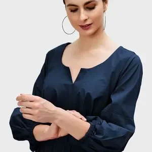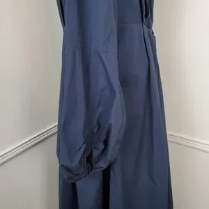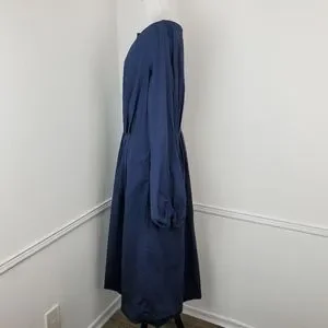 Eshakti Dress Bishop Sleeve Cotton Poplin Pleated Navy Blue Modest Classic Midi