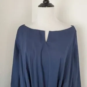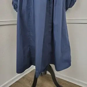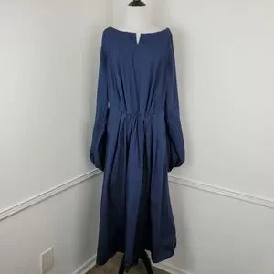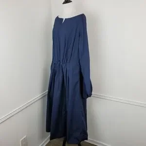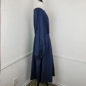 Features and description: dress; midi length; Bishop sleeves; poplin cotton; pleated skirt; split neck; pockets; navy blue