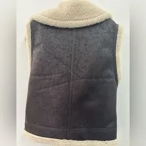 Faux shearling vest with full front zip. Contrast cream sherpa lining and collar. Rich brown outer with welt pockets. Cozy and stylish layering piece.