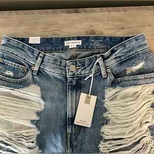 New with tags Good American The Khloé Jean in a light indigo wash. These statement jeans feature dramatic full-length distressed detailing down both legs for a bold, edgy look. Designed with a super high-rise waist and straight-leg fit, they provide a flattering silhouette with Good American’s signature tummy-control technology.