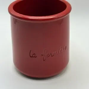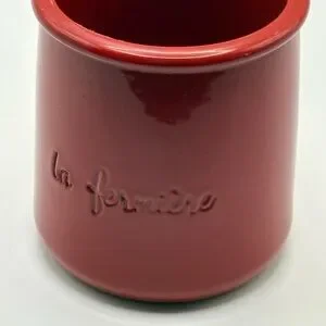 Collectible La Fermière red terracotta yogurt pot featuring an embossed cherub/cupid design, released as a limited Valentine’s Day edition. These iconic French yogurt pots are known for their rustic terracotta look and are often kept as decorative collectibles.