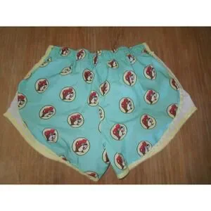 Buc-ee's brand running shorts in women's size medium. These shorts feature a light blue color with an all-over Buc-ee the Beaver logo print and yellow trim. They include an elastic waistband with an interior drawstring and a built-in liner for comfort. Excellent Condition!