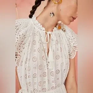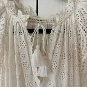 Beautiful Gianna Broderie Eyelet Midi Dress by Ulla Johnson in crisp white. This romantic bohemian dress features intricate embroidered eyelet detailing with scalloped trims and playful tassel accents. The flattering tiered silhouette with a cinchable drawstring waist creates an effortless, flowy fit.