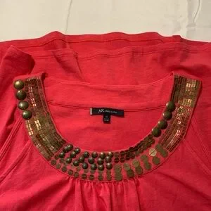 AK—Anne Klein salmon pink tank top with bronze sequin embellishments in different shapes & sizes around the necklace.