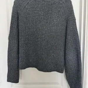 Cozy gray sweater. Button-up front. Ribbed texture. Perfect for layering.