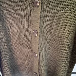 Chunky knit cardigan with a relaxed fit. V-neck and front button closure. Long balloon sleeves for a cozy look. Easy to layer over tops. Stylish everyday piece in olive green. NWT. Size Medium Oversized